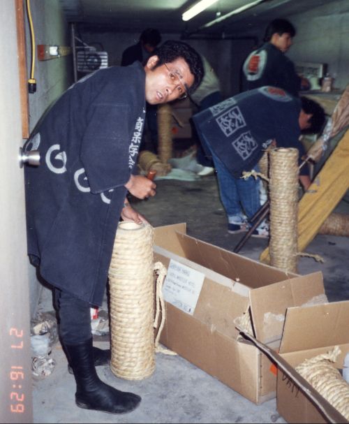 手筒花火の披露に備えてチェックや口切りをしています。